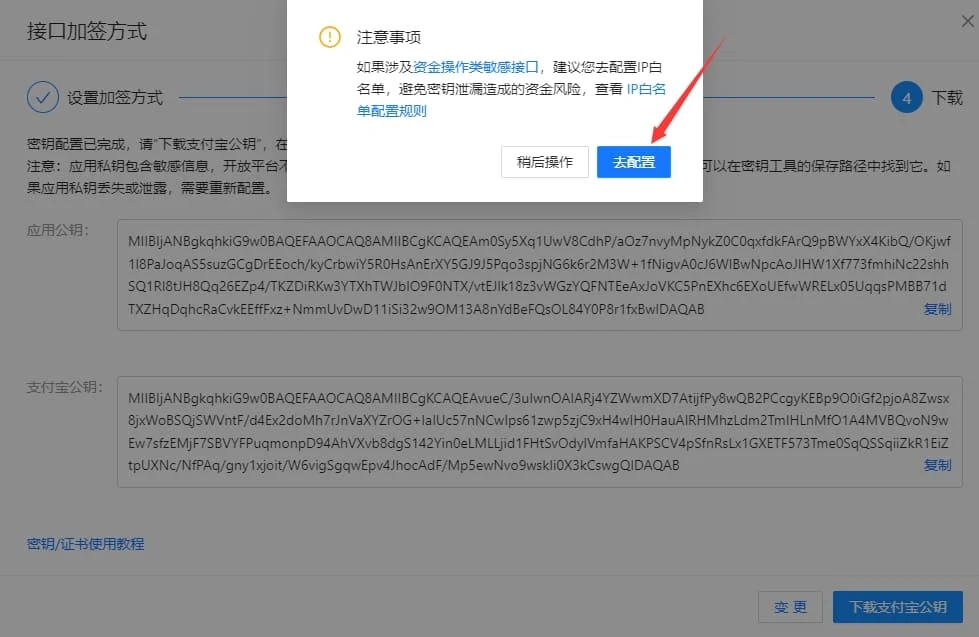 上传公钥后,系统可能会弹出提示,建议你设置当前服务器的 IP 白名单。此步骤可先忽略(即使未设置也能正常使用,但存在一定安全风险)。接着,请先复制或下载支付宝公钥备用。