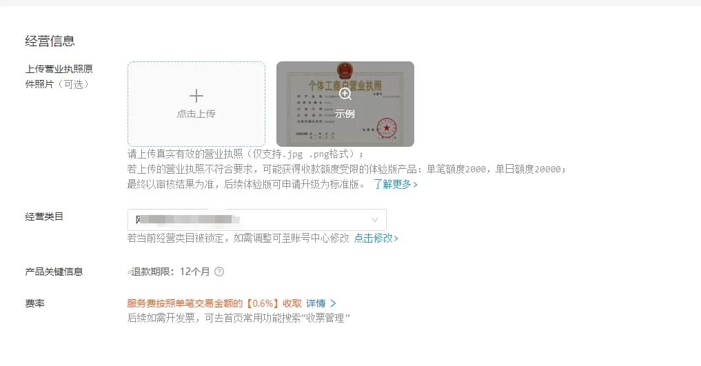 在资料填写页面,营业执照为非必填项,个人用户可选择不上传。填写“经营类目”时可根据自身情况选择,一般建议选择零售类,如“生活百货”。(不推荐选择“金融”或“网络服务”等敏感类目)
