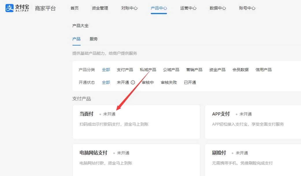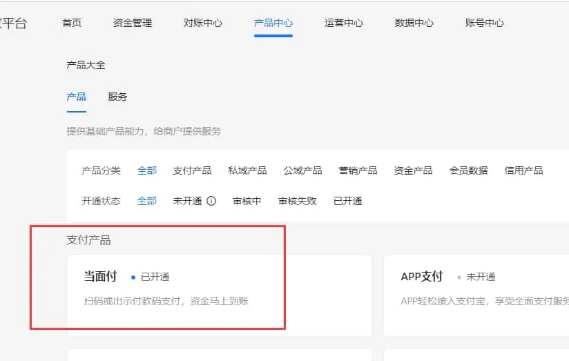在商家中心页面中,找到支付相关的产品服务,选择“当面付”功能模块,并点击“立即开通”以开始配置流程。