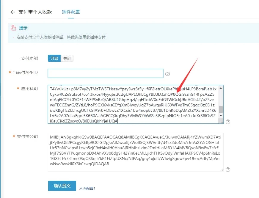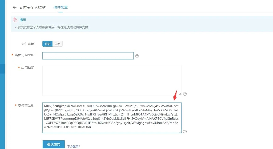 获取支付宝公钥后,需将其复制并填写到你网站后台对应插件的公钥输入栏中。