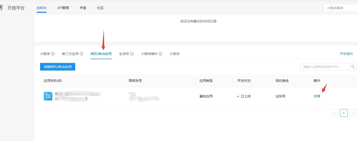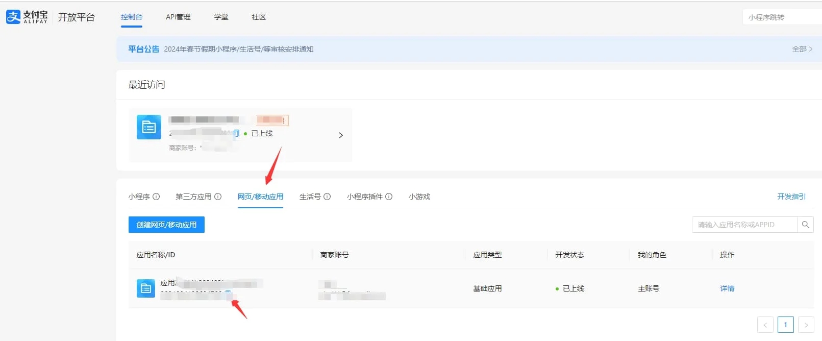 审核成功后,前往支付宝开放平台(网址:https://open.alipay.com/),根据你的需求选择“网页应用”或“移动应用”,然后点击对应应用的“详情”按钮进入设置界面。