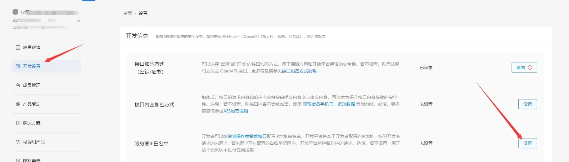 在应用详情页中,点击“开发设置”,找到并设置接口的加签(签名)方式。