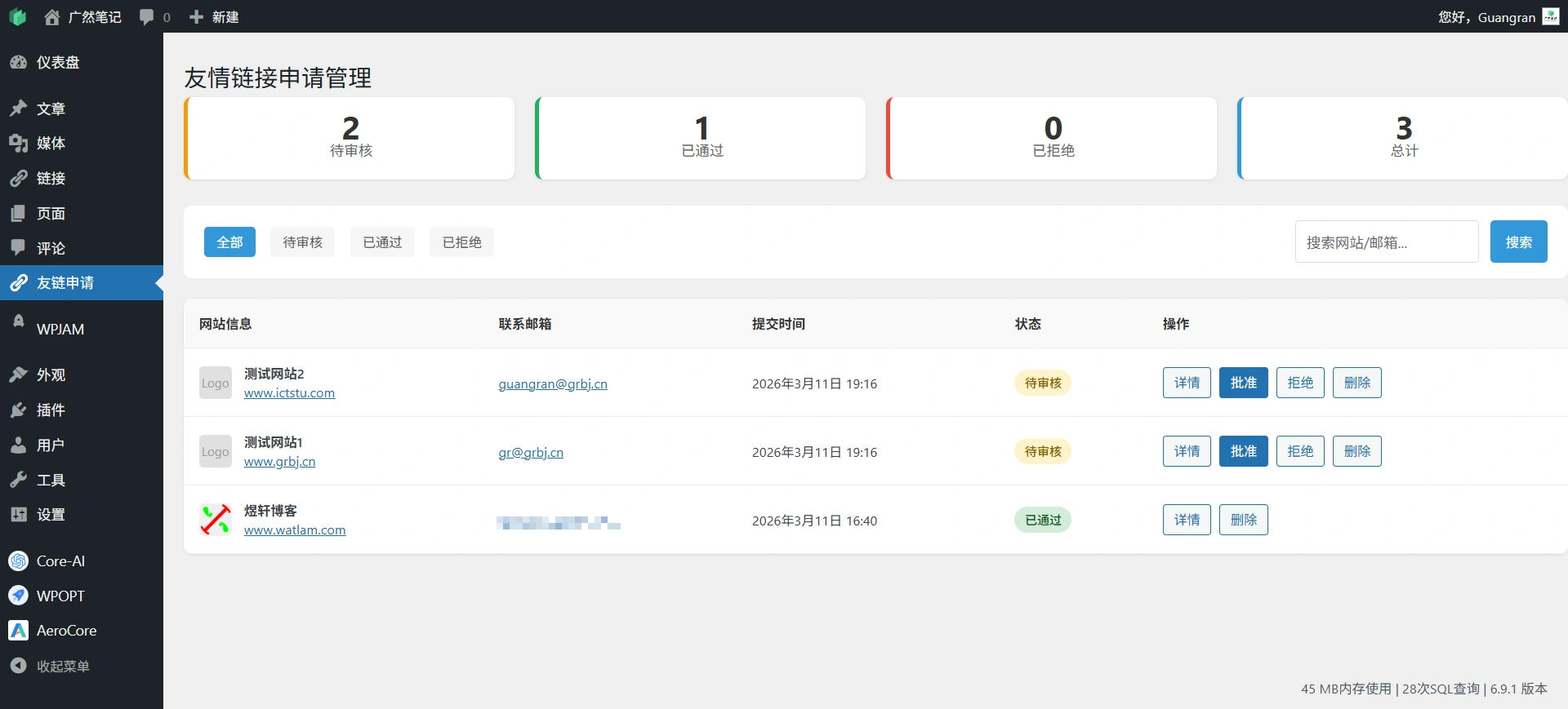 - 后台审核管理,批准/拒绝操作,自动添加到 WordPress 链接库