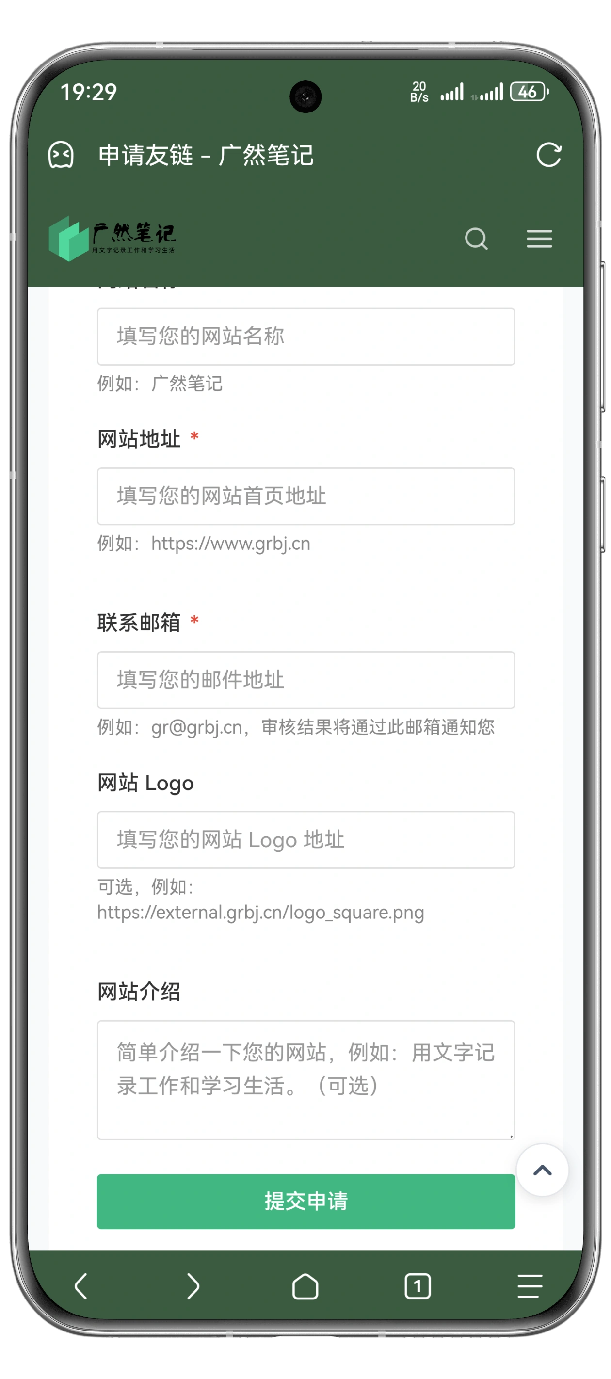 访客可以通过短代码 [friend_link_form] 在任意页面提交友链申请,收集以下信息: